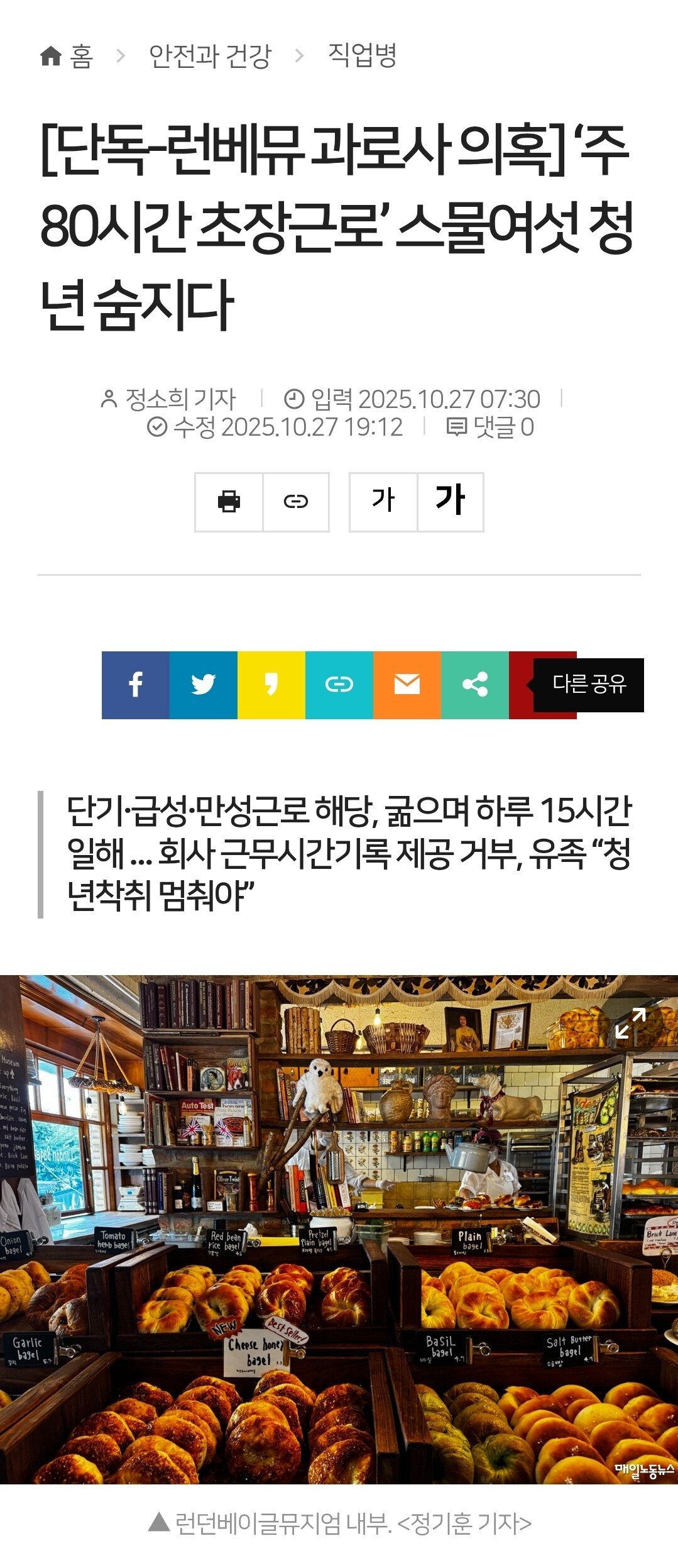 런던 베이글 뮤지엄 노동자 과로사 의혹