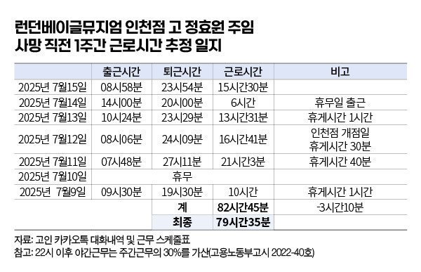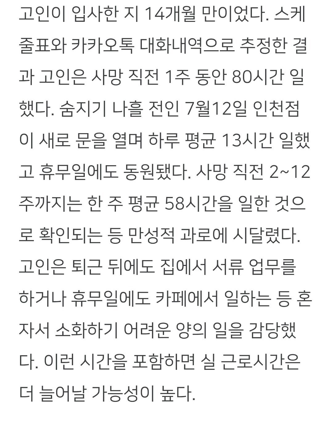 그리고 사망 1주전~사망한 당일까지 1주일에 80시간, 최장근로시간 21시간을 채움