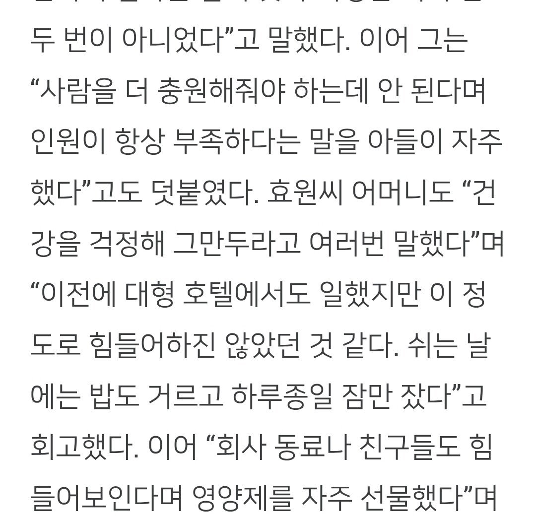 심지어 고인은 이전에 호텔에서도 일했었던 경력자이고 충원이 필요하다는걸 인지했지만 충원이 잘 이루어지지 않음