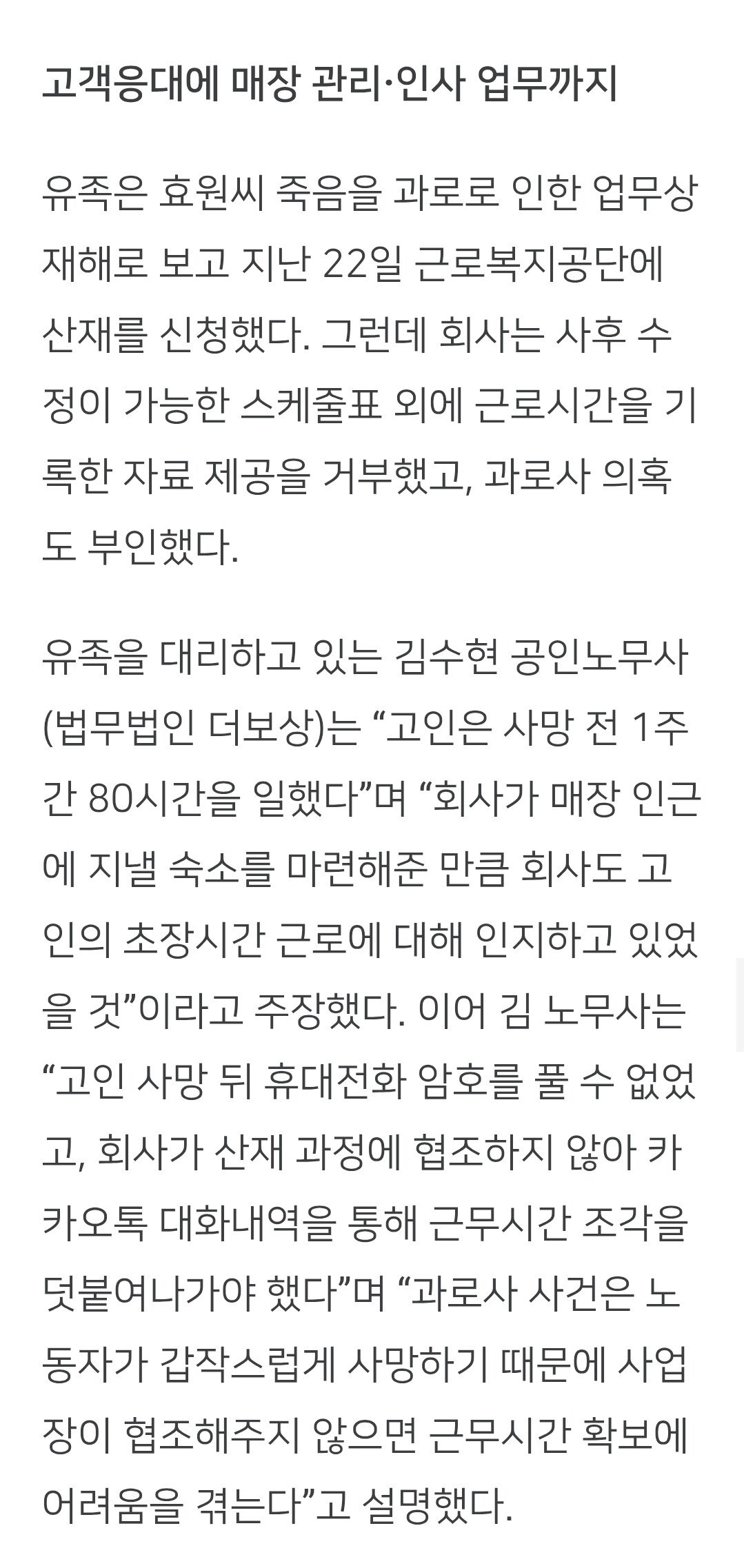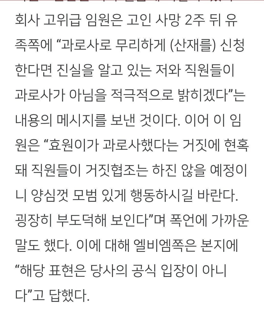 심지어 어떤 고위 임원은 과로사했다는 주장은 거짓이며 직원들이 거짓협조에 동참하지 않을꺼고 양심있게 행동하라는 언행을 함