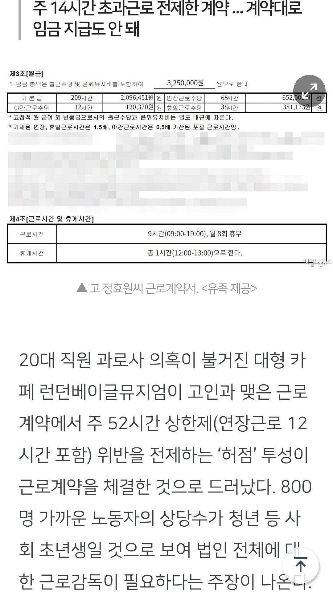고인의 월급은 325만원으로 책정돼 있는데, 기본급은 최저임금으로 시간외 근로수당이 월급의 36%를 차지.