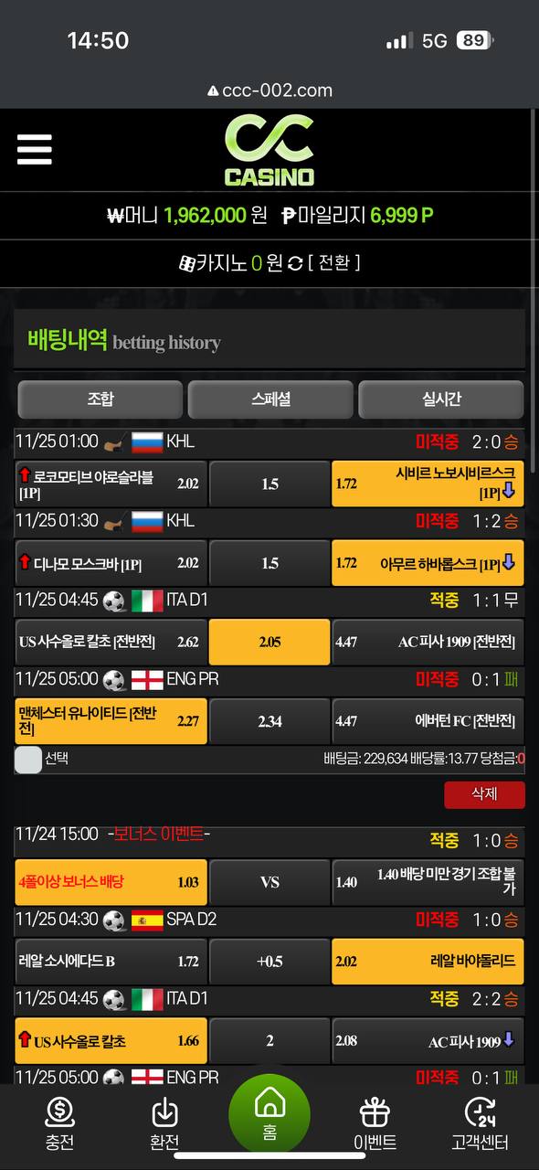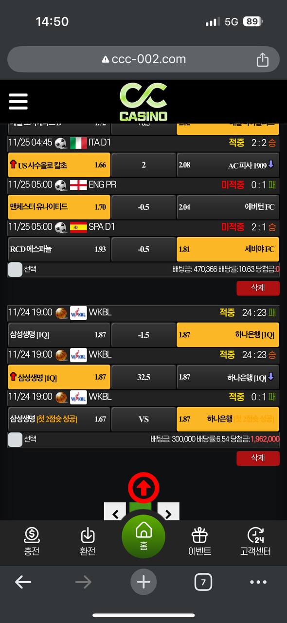 담당실장이 입플준다는거 안받고했는데 오늘은 한번 받고 해보려했더니 충전할일이없어서 당첨금으로 오늘배구랑 축구 질러놓고
