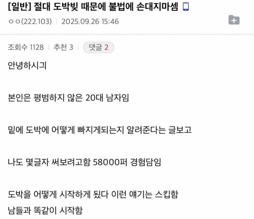 도박빚 때문에 캄보디아 갔다가 살아서 온 썰.jpg 작성자 정보 멜리켈테스쪽지보내기쪽지보내기 작성 작성일 2025.10.10 00:25 컨텐츠 정보 11,523 조회 0 추천 0 비추천 목록 신고 신고 관리 글수정 글삭제 본문 0 추천 추천 비추천 0 비추천 관련자료 댓글 0 등록된 댓글이 없습니다. 로그인한 회원만 댓글 등록이 가능합니다. 목록 신고 신고 관리 글수정 글삭제