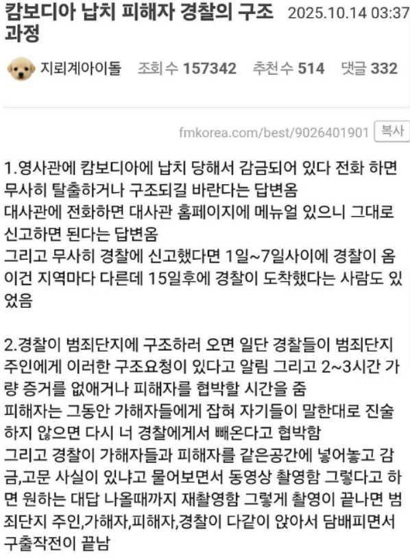 캄보디아 납치 피해자 구출과정 작성자 정보 BEATRICE쪽지보내기쪽지보내기 작성 작성일 2025.10.14 17:56 컨텐츠 정보 9,402 조회 0 추천 0 비추천 목록 신고 신고 관리 글수정 글삭제 본문 0 추천 추천 비추천 0 비추천 관련자료 댓글 0 등록된 댓글이 없습니다. 로그인한 회원만 댓글 등록이 가능합니다. 목록 신고 신고 관리 글수정 글삭제