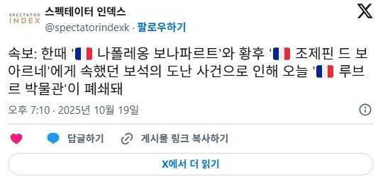BBC속보) 파리 루브르박물관에서 강도사건 발생 작성자 정보 PHERENIKE쪽지보내기쪽지보내기 작성 작성일 2025.10.19 21:02 컨텐츠 정보 7,934 조회 0 추천 0 비추천 목록 신고 신고 관리 글수정 글삭제 본문 0 추천 추천 비추천 0 비추천 관련자료 댓글 0 등록된 댓글이 없습니다. 로그인한 회원만 댓글 등록이 가능합니다. 목록 신고 신고 관리 글수정 글삭제